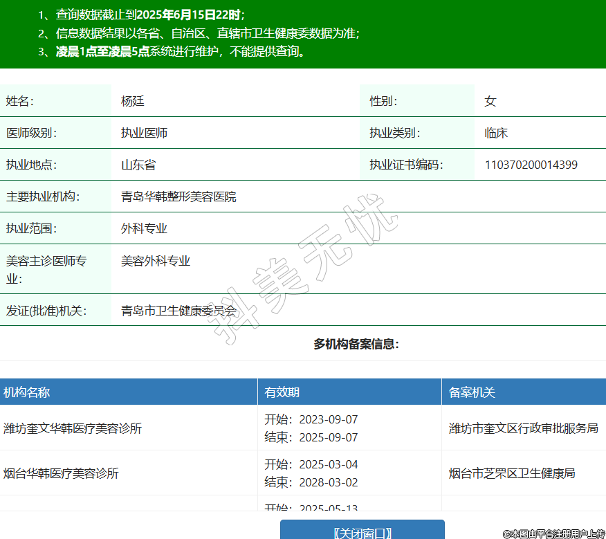 姓名:楊廷性別:女醫(yī)師級別:執(zhí)業(yè)醫(yī)師執(zhí)業(yè)類別:臨床執(zhí)業(yè)地點:山東省執(zhí)業(yè)證書編碼:110370200014399主要執(zhí)業(yè)機(jī)構(gòu):青島華韓整形美容醫(yī)院執(zhí)業(yè)范圍:外科專業(yè)美容主診醫(yī)師專業(yè):美容外科專業(yè)發(fā)證(批準(zhǔn))機(jī)關(guān):青島市衛(wèi)生健康委員會多機(jī)構(gòu)備案信息:機(jī)構(gòu)名稱 有效期 備案機(jī)關(guān) 濰坊奎文華韓醫(yī)療美容診所 開始:2023-09-07結(jié)束:2025-09-07濰坊市奎文區(qū)行政審批服務(wù)局 煙臺華韓醫(yī)療美容診所 開始:2025-03-04結(jié)束:2028-03-02煙臺市芝罘區(qū)衛(wèi)生健康局 濟(jì)南華韓醫(yī)療美容醫(yī)院 開始:2025-05-13結(jié)束:2027-05-12濟(jì)南市衛(wèi)生健康委員會 -