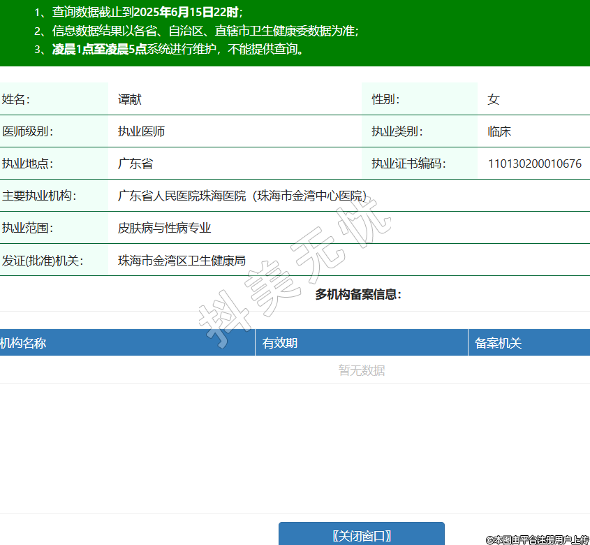 姓名:譚獻(xiàn)性別:女醫(yī)師級(jí)別:執(zhí)業(yè)醫(yī)師執(zhí)業(yè)類別:臨床執(zhí)業(yè)地點(diǎn):廣東省執(zhí)業(yè)證書編碼:110130200010676主要執(zhí)業(yè)機(jī)構(gòu):廣東省人民醫(yī)院珠海醫(yī)院(珠海市金灣中心醫(yī)院)執(zhí)業(yè)范圍:皮膚病與性病專業(yè)發(fā)證(批準(zhǔn))機(jī)關(guān):珠海市金灣區(qū)衛(wèi)生健康局 -