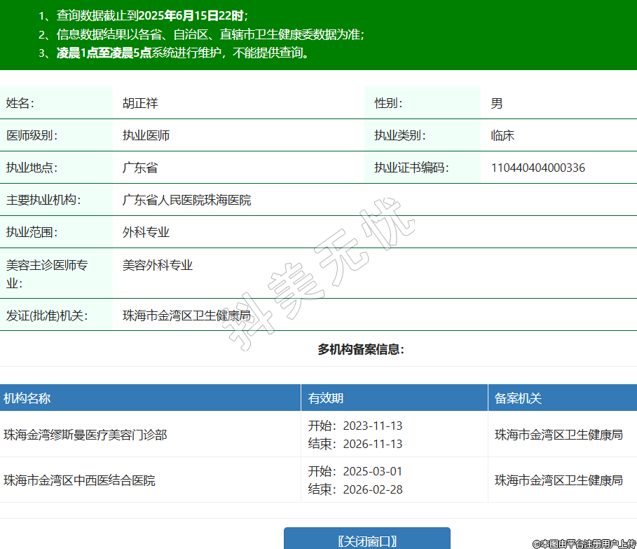 姓名:胡正祥性別:男醫(yī)師級(jí)別:執(zhí)業(yè)醫(yī)師執(zhí)業(yè)類別:臨床執(zhí)業(yè)地點(diǎn):廣東省執(zhí)業(yè)證書(shū)編碼:110440404000336主要執(zhí)業(yè)機(jī)構(gòu):廣東省人民醫(yī)院珠海醫(yī)院執(zhí)業(yè)范圍:外科專業(yè)美容主診醫(yī)師專業(yè):美容外科專業(yè)發(fā)證(批準(zhǔn))機(jī)關(guān):珠海市金灣區(qū)衛(wèi)生健康局多機(jī)構(gòu)備案信息:機(jī)構(gòu)名稱 有效期 備案機(jī)關(guān) 珠海金灣繆斯曼醫(yī)療美容門(mén)診部 開(kāi)始:2023-11-13結(jié)束:2026-11-13珠海市金灣區(qū)衛(wèi)生健康局 珠海市金灣區(qū)中西醫(yī)結(jié)合醫(yī)院 開(kāi)始:2025-03-01結(jié)束:2026-02-28珠海市金灣區(qū)衛(wèi)生健康局 -