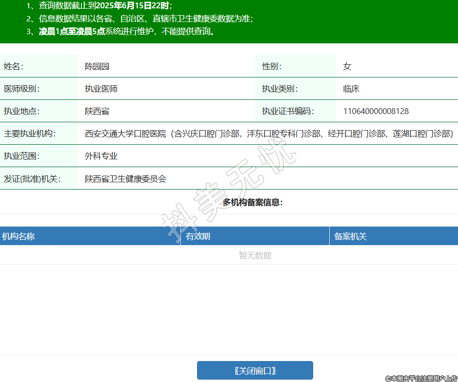 姓名:陳園園性別:女醫(yī)師級別:執(zhí)業(yè)醫(yī)師執(zhí)業(yè)類別:臨床執(zhí)業(yè)地點(diǎn):陜西省執(zhí)業(yè)證書編碼:110640000008128主要執(zhí)業(yè)機(jī)構(gòu):西安交通大學(xué)口腔醫(yī)院(含興慶口腔門診部,灃東口腔專科門診部、經(jīng)開口腔門診部、蓮湖口腔門診部)執(zhí)業(yè)范圍:外科專業(yè)發(fā)證(批準(zhǔn))機(jī)關(guān):陜西省衛(wèi)生健康委員會 -