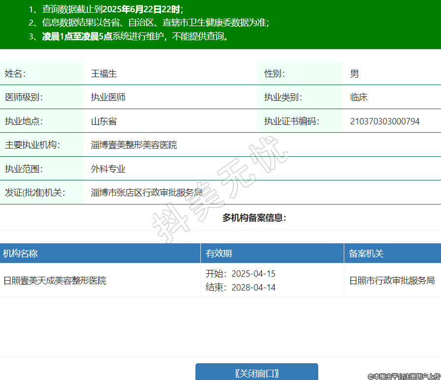 姓名:王福生性別:男醫(yī)師級(jí)別:執(zhí)業(yè)醫(yī)師執(zhí)業(yè)類(lèi)別:臨床執(zhí)業(yè)地點(diǎn):山東省執(zhí)業(yè)證書(shū)編碼:210370303000794主要執(zhí)業(yè)機(jī)構(gòu):淄博壹美整形美容醫(yī)院執(zhí)業(yè)范圍:外科專(zhuān)業(yè)發(fā)證(批準(zhǔn))機(jī)關(guān):淄博市張店區(qū)行政審批服務(wù)局多機(jī)構(gòu)備案信息:機(jī)構(gòu)名稱(chēng) 有效期 備案機(jī)關(guān) 日照壹美天成美容整形醫(yī)院 開(kāi)始:2025-04-15結(jié)束:2028-04-14日照市行政審批服務(wù)局 -