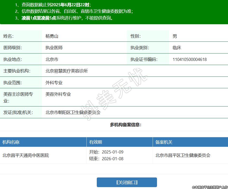 姓名:楊勇山性別:男醫(yī)師級(jí)別:執(zhí)業(yè)醫(yī)師執(zhí)業(yè)類別:臨床執(zhí)業(yè)地點(diǎn):北京市執(zhí)業(yè)證書編碼:110410500004618主要執(zhí)業(yè)機(jī)構(gòu):北京易慧醫(yī)療美容診所執(zhí)業(yè)范圍:外科專業(yè)美容主診醫(yī)師專業(yè):美容外科專業(yè)發(fā)證(批準(zhǔn))機(jī)關(guān):北京市朝陽(yáng)區(qū)衛(wèi)生健康委員會(huì)多機(jī)構(gòu)備案信息:機(jī)構(gòu)名稱 有效期 備案機(jī)關(guān) 北京昌平天通苑中醫(yī)醫(yī)院 開始:2025-01-09結(jié)束:2026-01-08北京市昌平區(qū)衛(wèi)生健康委員會(huì) -