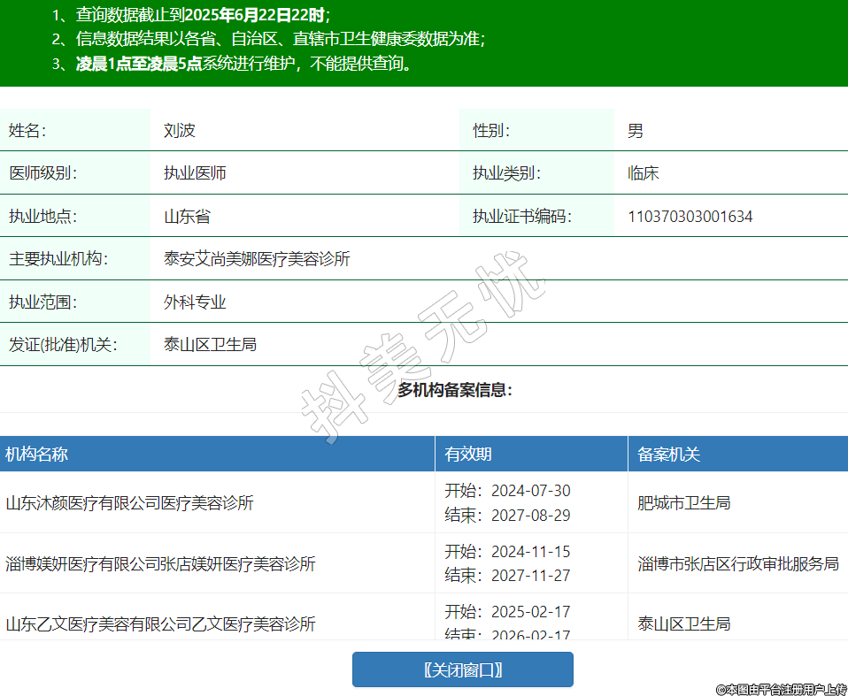 姓名:劉波性別:男醫(yī)師級(jí)別:執(zhí)業(yè)醫(yī)師執(zhí)業(yè)類別:臨床執(zhí)業(yè)地點(diǎn):山東省執(zhí)業(yè)證書(shū)編碼:110370303001634主要執(zhí)業(yè)機(jī)構(gòu):泰安艾尚美娜醫(yī)療美容診所執(zhí)業(yè)范圍:外科專業(yè)發(fā)證(批準(zhǔn))機(jī)關(guān):泰山區(qū)衛(wèi)生局多機(jī)構(gòu)備案信息:機(jī)構(gòu)名稱 有效期 備案機(jī)關(guān) 山東沐顏醫(yī)療有限公司醫(yī)療美容診所 開(kāi)始:2024-07-30結(jié)束:2027-08-29肥城市衛(wèi)生局 淄博媄妍醫(yī)療有限公司張店媄妍醫(yī)療美容診所 開(kāi)始:2024-11-15結(jié)束:2027-11-27淄博市張店區(qū)行政審批服務(wù)局 山東乙文醫(yī)療美容有限公司乙文醫(yī)療美容診所 開(kāi)始:2025-02-17結(jié)束:2026-02-17泰山區(qū)衛(wèi)生局 -