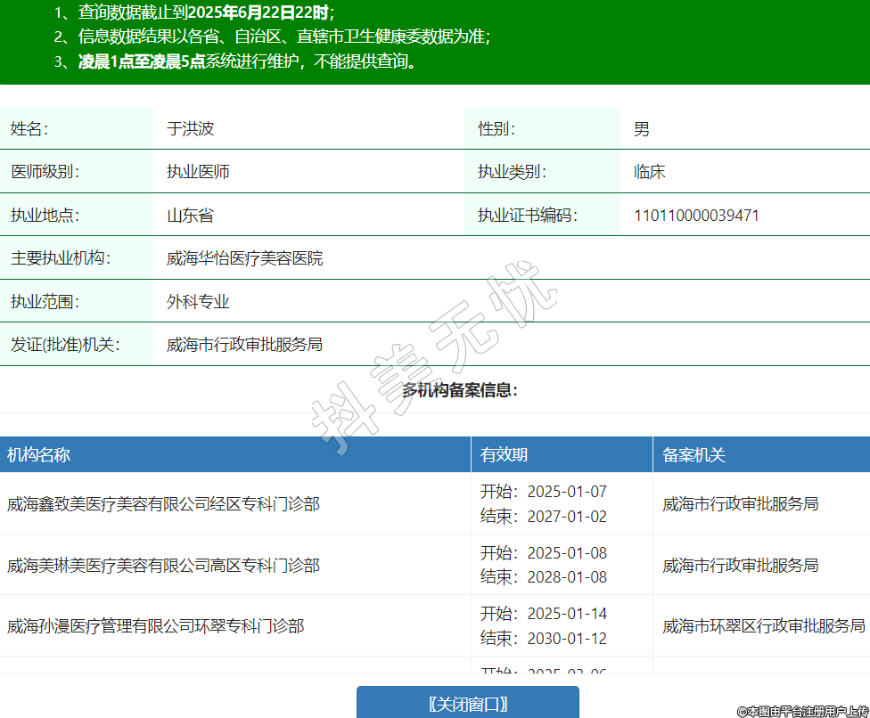 姓名:于洪波性別:男醫(yī)師級別:執(zhí)業(yè)醫(yī)師執(zhí)業(yè)類別:臨床執(zhí)業(yè)地點(diǎn):山東省執(zhí)業(yè)證書編碼:110110000039471主要執(zhí)業(yè)機(jī)構(gòu):威海華怡醫(yī)療美容醫(yī)院執(zhí)業(yè)范圍:外科專業(yè)發(fā)證(批準(zhǔn))機(jī)關(guān):威海市行政審批服務(wù)局多機(jī)構(gòu)備案信息:機(jī)構(gòu)名稱 有效期 備案機(jī)關(guān) 威海鑫致美醫(yī)療美容有限公司經(jīng)區(qū)??崎T診部 開始:2025-01-07結(jié)束:2027-01-02威海市行政審批服務(wù)局 威海美琳美醫(yī)療美容有限公司高區(qū)??崎T診部 開始:2025-01-08結(jié)束:2028-01-08威海市行政審批服務(wù)局 威海孫漫醫(yī)療管理有限公司環(huán)翠??崎T診部 開始:2025-01-14結(jié)束:2030-01-12威海市環(huán)翠區(qū)行政審批服務(wù)局 環(huán)翠蘭積??崎T診部 開始:2025-03-06結(jié)束:2030-02-13威海市環(huán)翠區(qū)行政審批服務(wù)局 威海華怡口腔門診部有限公司環(huán)翠口腔門診部 開始:2025-03-10結(jié)束:2030-03-10威海市環(huán)翠區(qū)行政審批服務(wù)局 藝添致美(威海)醫(yī)療美容有限公司經(jīng)區(qū)??崎T診部 開始:2025-04-22結(jié)束:2035-04-23威海市行政審批服務(wù)局 -