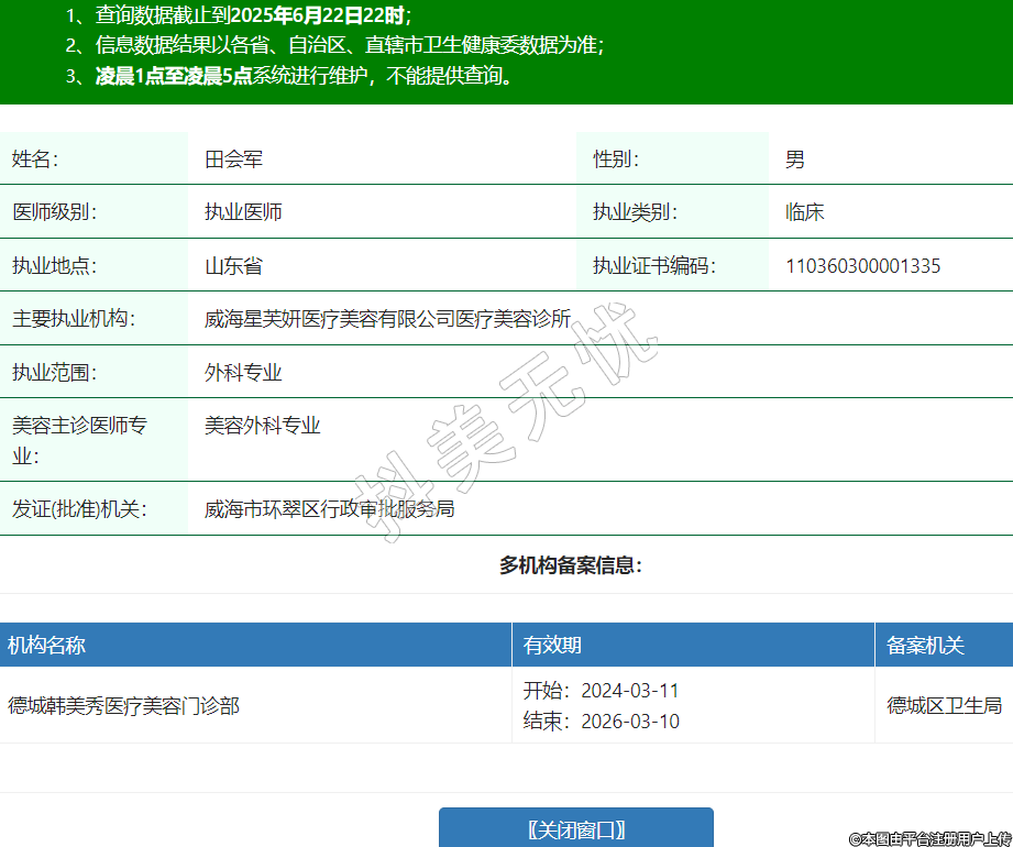 姓名:田會(huì)軍性別:男醫(yī)師級(jí)別:執(zhí)業(yè)醫(yī)師執(zhí)業(yè)類別:臨床執(zhí)業(yè)地點(diǎn):山東省執(zhí)業(yè)證書(shū)編碼:110360300001335主要執(zhí)業(yè)機(jī)構(gòu):威海星芙妍醫(yī)療美容有限公司醫(yī)療美容診所執(zhí)業(yè)范圍:外科專業(yè)美容主診醫(yī)師專業(yè):美容外科專業(yè)發(fā)證(批準(zhǔn))機(jī)關(guān):威海市環(huán)翠區(qū)行政審批服務(wù)局多機(jī)構(gòu)備案信息:機(jī)構(gòu)名稱 有效期 備案機(jī)關(guān) 德城韓美秀醫(yī)療美容門(mén)診部 開(kāi)始:2024-03-11結(jié)束:2026-03-10德城區(qū)衛(wèi)生局 -