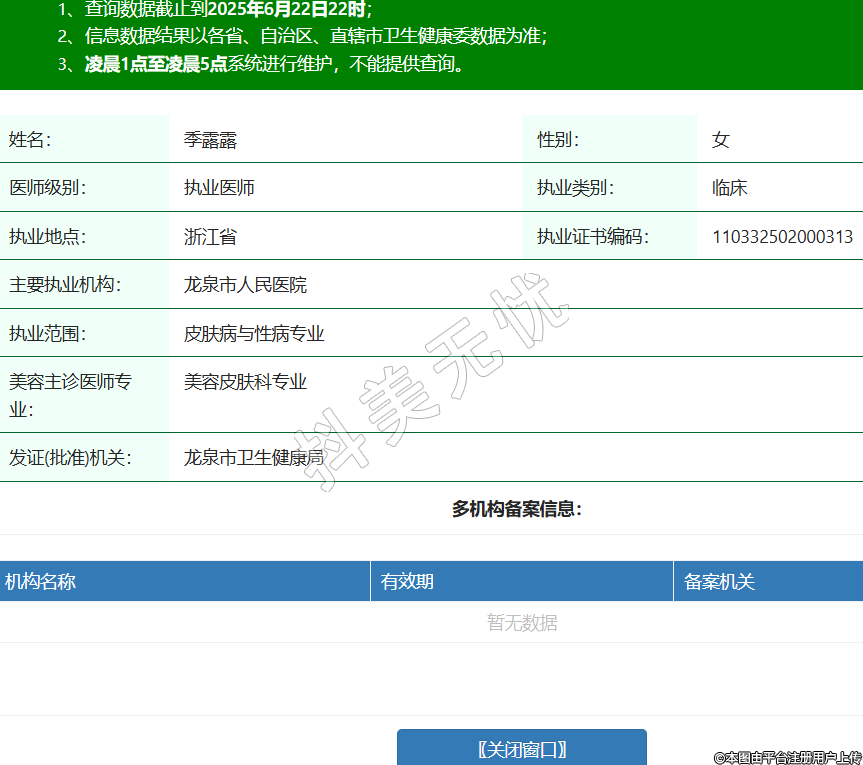 姓名:季露露性別:女醫(yī)師級別:執(zhí)業(yè)醫(yī)師執(zhí)業(yè)類別:臨床執(zhí)業(yè)地點:浙江省執(zhí)業(yè)證書編碼:110332502000313主要執(zhí)業(yè)機構(gòu):龍泉市人民醫(yī)院執(zhí)業(yè)范圍:皮膚病與性病專業(yè)美容主診醫(yī)師專業(yè):美容皮膚科專業(yè)發(fā)證(批準)機關(guān):龍泉市衛(wèi)生健康局 -