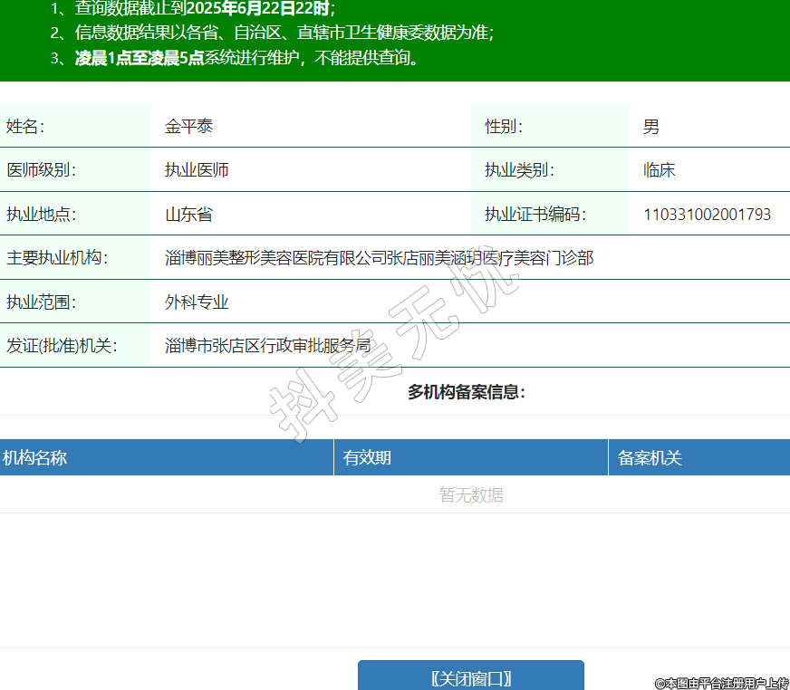 姓名:金平泰性別:男醫(yī)師級別:執(zhí)業(yè)醫(yī)師執(zhí)業(yè)類別:臨床執(zhí)業(yè)地點:山東省執(zhí)業(yè)證書編碼:110331002001793主要執(zhí)業(yè)機構:淄博麗美整形美容醫(yī)院有限公司張店麗美涵玥醫(yī)療美容門診部執(zhí)業(yè)范圍:外科專業(yè)發(fā)證(批準)機關:淄博市張店區(qū)行政審批服務局 -