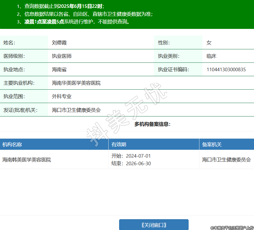 姓名:劉德霞性別:女醫(yī)師級別:執(zhí)業(yè)醫(yī)師執(zhí)業(yè)類別:臨床執(zhí)業(yè)地點:海南省執(zhí)業(yè)證書編碼:110441303000835主要執(zhí)業(yè)機構(gòu):海南華美醫(yī)學美容醫(yī)院執(zhí)業(yè)范圍:外科專業(yè)發(fā)證(批準)機關:??谑行l(wèi)生健康委員會多機構(gòu)備案信息:機構(gòu)名稱 有效期 備案機關 海南韓美醫(yī)學美容醫(yī)院 開始:2024-07-01結(jié)束:2026-06-30海口市衛(wèi)生健康委員會 -