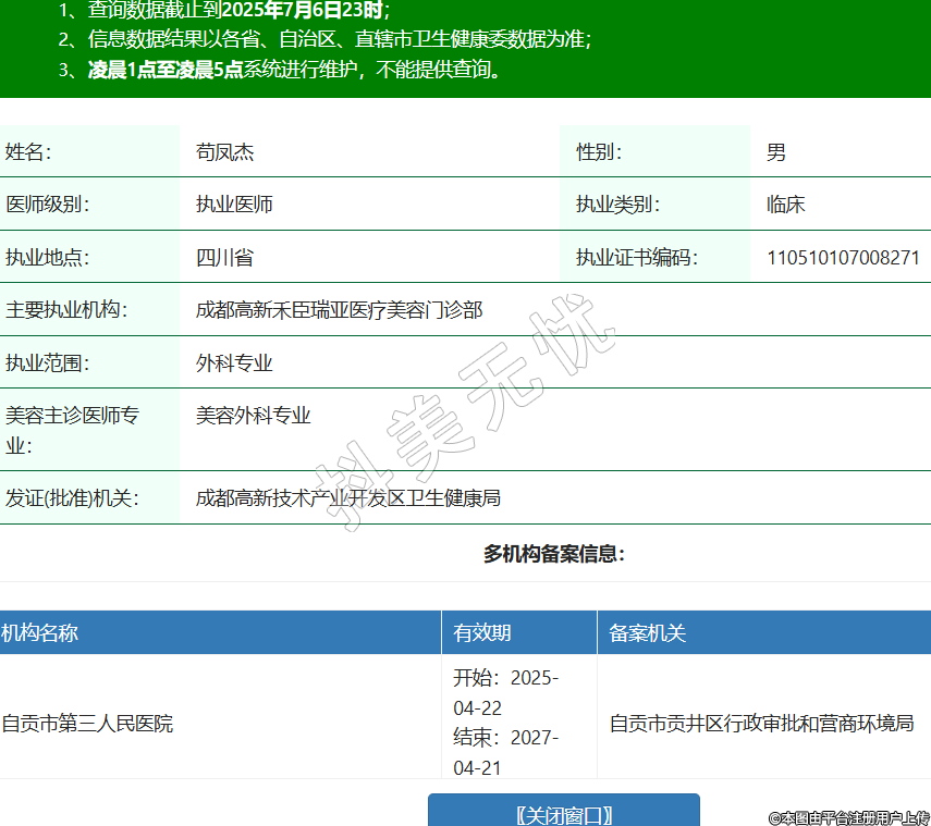 姓名:茍鳳杰性別:男醫(yī)師級別:執(zhí)業(yè)醫(yī)師執(zhí)業(yè)類別:臨床執(zhí)業(yè)地點:四川省執(zhí)業(yè)證書編碼:110510107008271主要執(zhí)業(yè)機構(gòu):成都高新禾臣瑞亞醫(yī)療美容門診部執(zhí)業(yè)范圍:外科專業(yè)美容主診醫(yī)師專業(yè):美容外科專業(yè)發(fā)證(批準(zhǔn))機關(guān):成都高新技術(shù)產(chǎn)業(yè)開發(fā)區(qū)衛(wèi)生健康局多機構(gòu)備案信息:機構(gòu)名稱 有效期 備案機關(guān) 自貢市第三人民醫(yī)院 開始:2025-04-22結(jié)束:2027-04-21自貢市貢井區(qū)行政審批和營商環(huán)境局 成都青羊蘭妃韻醫(yī)療美容門診部 開始:2025-06-11結(jié)束:2027-06-10成都市青羊區(qū)行政審批局(成都市青羊區(qū)政務(wù)服務(wù)管理和網(wǎng)絡(luò)理政辦公室) 志輝醫(yī)院 開始:2025-06-13結(jié)束:2027-06-12成都市新津區(qū)行政審批局 成都高新高鑫醫(yī)療美容門診部 開始:2025-06-17結(jié)束:2027-06-16成都高新技術(shù)產(chǎn)業(yè)開發(fā)區(qū)衛(wèi)生健康局 江油安麗維麗星醫(yī)療美容診所 開始:2025-06-19結(jié)束:2027-06-18江油市政務(wù)服務(wù)和行政審批局 成都武侯華馨聚美綜合門診部 開始:2025-06-23結(jié)束:2027-06-22成都市武侯區(qū)行政審批局 資陽雁江儷姿醫(yī)療美容門診部有限公司建設(shè)南路醫(yī)療美容門診部 開始:2025-06-24結(jié)束:2027-06-23資陽市雁江區(qū)衛(wèi)生健康局 -