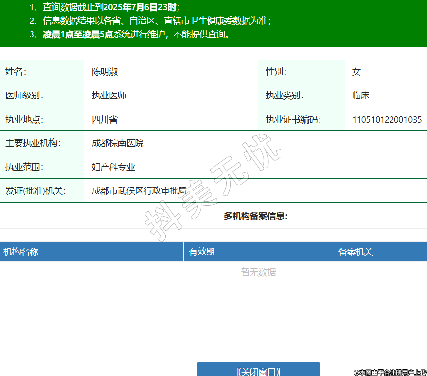 姓名:陳明淑性別:女醫(yī)師級別:執(zhí)業(yè)醫(yī)師執(zhí)業(yè)類別:臨床執(zhí)業(yè)地點(diǎn):四川省執(zhí)業(yè)證書編碼:110510122001035主要執(zhí)業(yè)機(jī)構(gòu):成都棕南醫(yī)院執(zhí)業(yè)范圍:婦產(chǎn)科專業(yè)發(fā)證(批準(zhǔn))機(jī)關(guān):成都市武侯區(qū)行政審批局 -