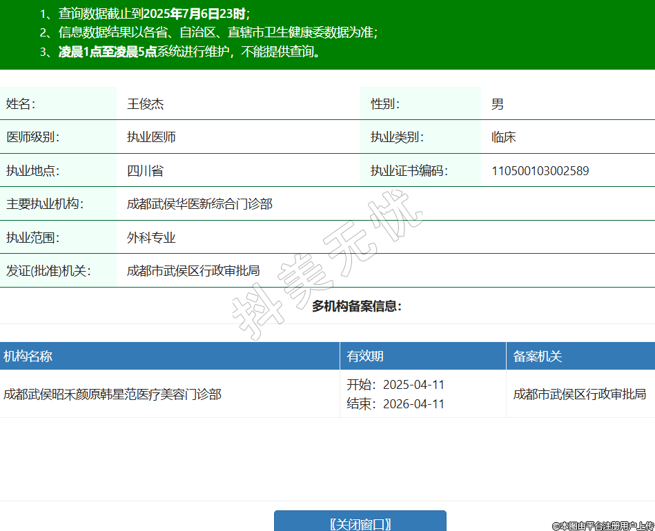 姓名:王俊杰性別:男醫(yī)師級別:執(zhí)業(yè)醫(yī)師執(zhí)業(yè)類別:臨床執(zhí)業(yè)地點:四川省執(zhí)業(yè)證書編碼:110500103002589主要執(zhí)業(yè)機構(gòu):成都武侯華醫(yī)新綜合門診部執(zhí)業(yè)范圍:外科專業(yè)發(fā)證(批準)機關(guān):成都市武侯區(qū)行政審批局多機構(gòu)備案信息:機構(gòu)名稱 有效期 備案機關(guān) 成都武侯昭禾顏原韓星范醫(yī)療美容門診部 開始:2025-04-11結(jié)束:2026-04-11成都市武侯區(qū)行政審批局 -
