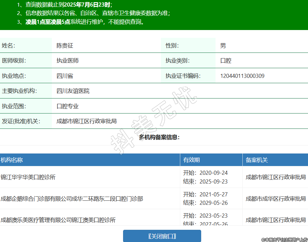 姓名:陳貴征性別:男醫(yī)師級別:執(zhí)業(yè)醫(yī)師執(zhí)業(yè)類別:口腔執(zhí)業(yè)地點:四川省執(zhí)業(yè)證書編碼:120440113000309主要執(zhí)業(yè)機構(gòu):四川友誼醫(yī)院執(zhí)業(yè)范圍:口腔專業(yè)發(fā)證(批準)機關(guān):成都市錦江區(qū)行政審批局多機構(gòu)備案信息:機構(gòu)名稱 有效期 備案機關(guān) 錦江華宇華美口腔診所 開始:2020-09-24結(jié)束:2025-09-23成都市錦江區(qū)行政審批局 成都企鵝綜合門診部有限公司成華二環(huán)路東二段口腔門診部 開始:2021-05-27結(jié)束:2029-05-26成都市成華區(qū)行政審批局 成都澳樂美醫(yī)療管理有限公司錦江澳美口腔診所 開始:2023-05-23結(jié)束:2027-05-26成都市錦江區(qū)行政審批局 -