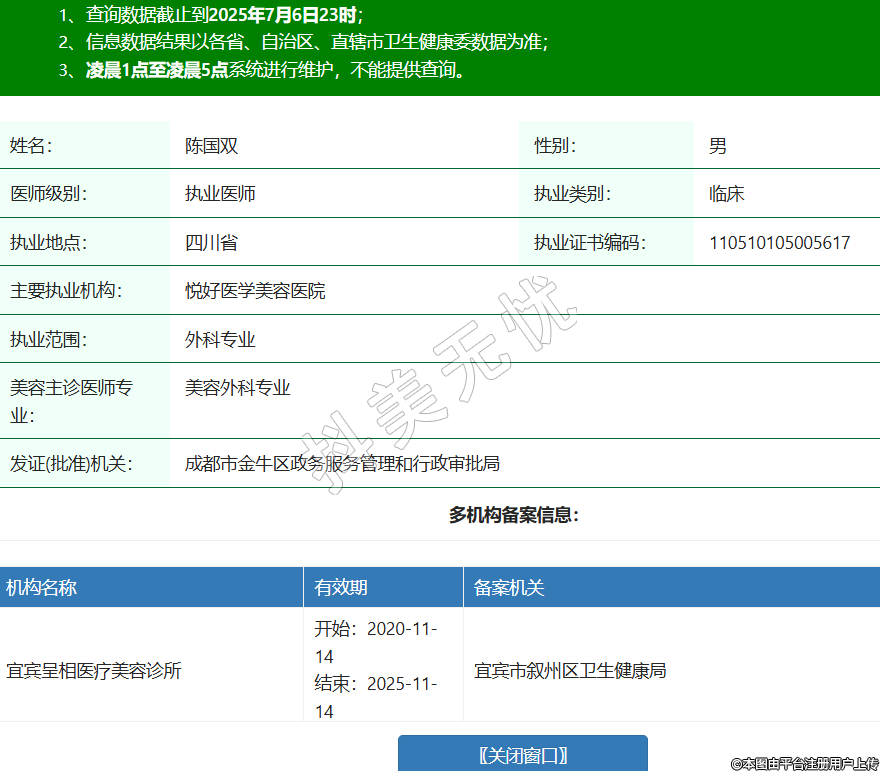 姓名:陳國(guó)雙性別:男醫(yī)師級(jí)別:執(zhí)業(yè)醫(yī)師執(zhí)業(yè)類(lèi)別:臨床執(zhí)業(yè)地點(diǎn):四川省執(zhí)業(yè)證書(shū)編碼:110510105005617主要執(zhí)業(yè)機(jī)構(gòu):悅好醫(yī)學(xué)美容醫(yī)院執(zhí)業(yè)范圍:外科專(zhuān)業(yè)美容主診醫(yī)師專(zhuān)業(yè):美容外科專(zhuān)業(yè)發(fā)證(批準(zhǔn))機(jī)關(guān):成都市金牛區(qū)政務(wù)服務(wù)管理和行政審批局多機(jī)構(gòu)備案信息:機(jī)構(gòu)名稱 有效期 備案機(jī)關(guān) 宜賓呈相醫(yī)療美容診所 開(kāi)始:2020-11-14結(jié)束:2025-11-14宜賓市敘州區(qū)衛(wèi)生健康局 成都青羊華人醫(yī)聯(lián)為美醫(yī)療美容門(mén)診部 開(kāi)始:2023-07-08結(jié)束:2025-08-08成都市青羊區(qū)行政審批局(成都市青羊區(qū)政務(wù)服務(wù)管理和網(wǎng)絡(luò)理政辦公室) 成都高新維星顏醫(yī)療美容門(mén)診部 開(kāi)始:2023-08-16結(jié)束:2025-08-15成都高新技術(shù)產(chǎn)業(yè)開(kāi)發(fā)區(qū)衛(wèi)生健康局 成都錦欣婦產(chǎn)科醫(yī)院 開(kāi)始:2023-09-09結(jié)束:2025-09-07成都市錦江區(qū)行政審批局 -