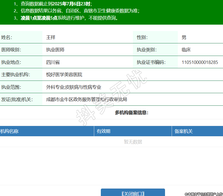 姓名:王祥性別:男醫(yī)師級(jí)別:執(zhí)業(yè)醫(yī)師執(zhí)業(yè)類別:臨床執(zhí)業(yè)地點(diǎn):四川省執(zhí)業(yè)證書編碼:110510000018285主要執(zhí)業(yè)機(jī)構(gòu):悅好醫(yī)學(xué)美容醫(yī)院執(zhí)業(yè)范圍:外科專業(yè);皮膚病與性病專業(yè)發(fā)證(批準(zhǔn))機(jī)關(guān):成都市金牛區(qū)政務(wù)服務(wù)管理和行政審批局 -