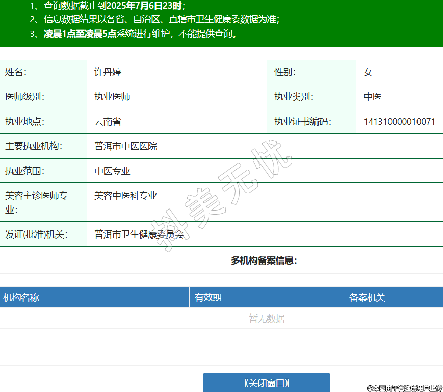 姓名:許丹婷性別:女醫(yī)師級(jí)別:執(zhí)業(yè)醫(yī)師執(zhí)業(yè)類別:中醫(yī)執(zhí)業(yè)地點(diǎn):云南省執(zhí)業(yè)證書編碼:141310000010071主要執(zhí)業(yè)機(jī)構(gòu):普洱市中醫(yī)醫(yī)院執(zhí)業(yè)范圍:中醫(yī)專業(yè)美容主診醫(yī)師專業(yè):美容中醫(yī)科專業(yè)發(fā)證(批準(zhǔn))機(jī)關(guān):普洱市衛(wèi)生健康委員會(huì) -