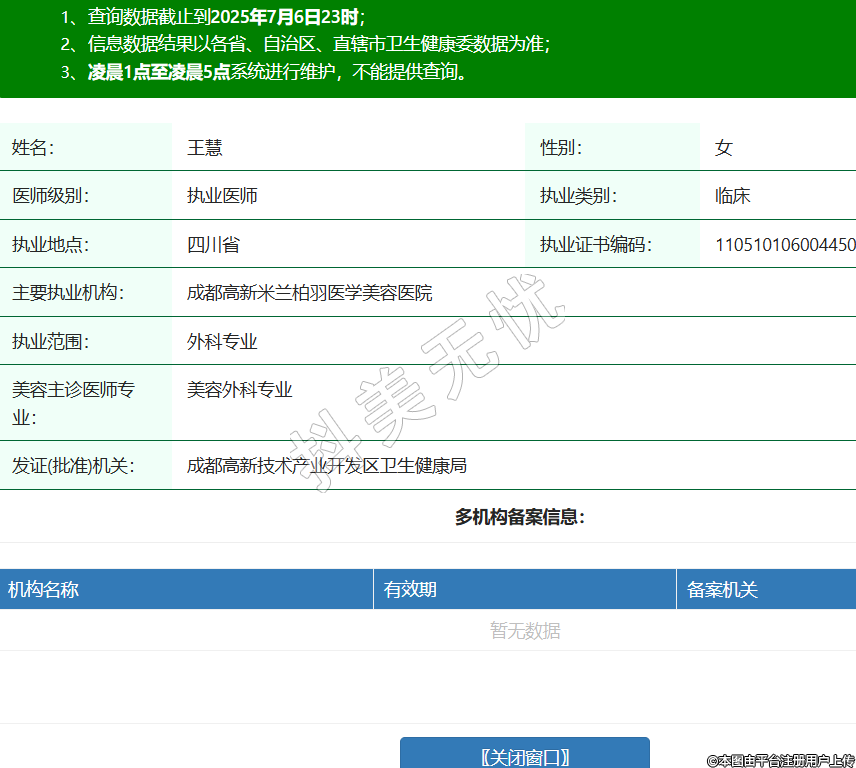 姓名:王慧性別:女醫(yī)師級(jí)別:執(zhí)業(yè)醫(yī)師執(zhí)業(yè)類別:臨床執(zhí)業(yè)地點(diǎn):四川省執(zhí)業(yè)證書編碼:110510106004450主要執(zhí)業(yè)機(jī)構(gòu):成都高新米蘭柏羽醫(yī)學(xué)美容醫(yī)院執(zhí)業(yè)范圍:外科專業(yè)美容主診醫(yī)師專業(yè):美容外科專業(yè)發(fā)證(批準(zhǔn))機(jī)關(guān):成都高新技術(shù)產(chǎn)業(yè)開(kāi)發(fā)區(qū)衛(wèi)生健康局 -
