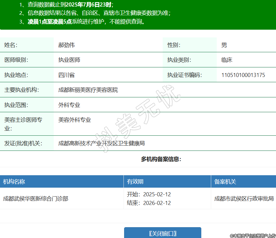 姓名:郝勁偉性別:男醫(yī)師級(jí)別:執(zhí)業(yè)醫(yī)師執(zhí)業(yè)類別:臨床執(zhí)業(yè)地點(diǎn):四川省執(zhí)業(yè)證書編碼:110510100013175主要執(zhí)業(yè)機(jī)構(gòu):成都新麗美醫(yī)療美容醫(yī)院執(zhí)業(yè)范圍:外科專業(yè)美容主診醫(yī)師專業(yè):美容外科專業(yè)發(fā)證(批準(zhǔn))機(jī)關(guān):成都高新技術(shù)產(chǎn)業(yè)開發(fā)區(qū)衛(wèi)生健康局多機(jī)構(gòu)備案信息:機(jī)構(gòu)名稱 有效期 備案機(jī)關(guān) 成都武侯華醫(yī)新綜合門診部 開始:2025-02-12結(jié)束:2026-02-12成都市武侯區(qū)行政審批局 -