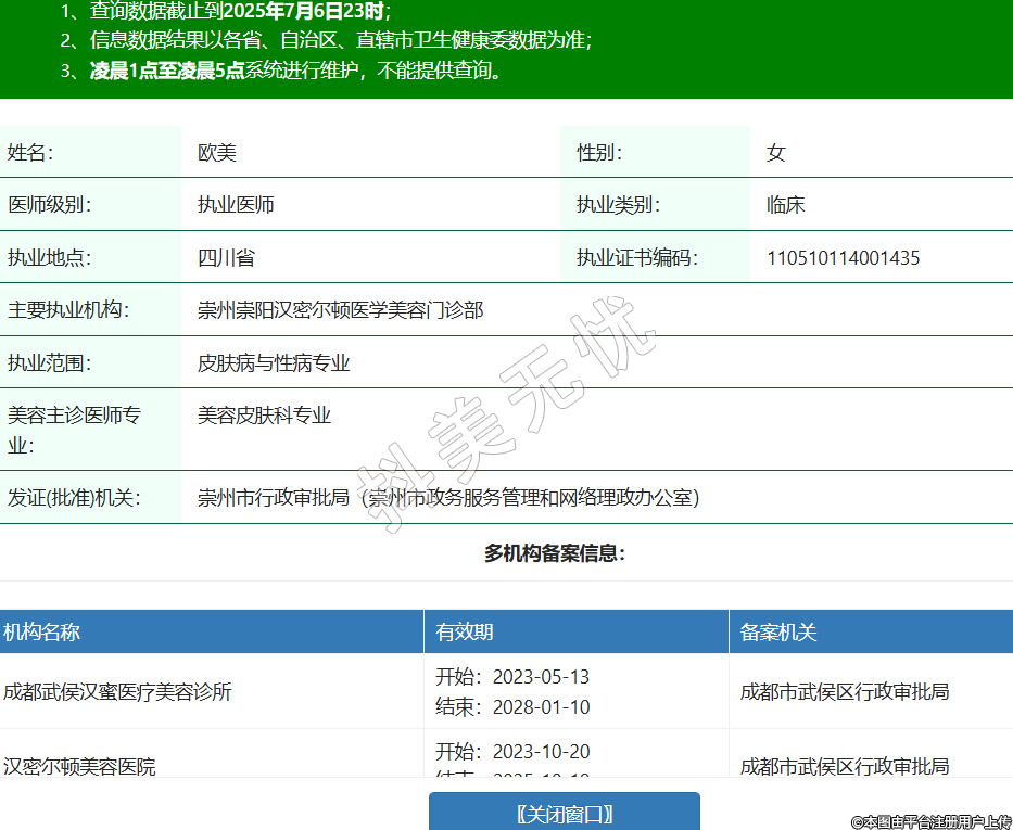 姓名:歐美性別:女醫(yī)師級(jí)別:執(zhí)業(yè)醫(yī)師執(zhí)業(yè)類別:臨床執(zhí)業(yè)地點(diǎn):四川省執(zhí)業(yè)證書編碼:110510114001435主要執(zhí)業(yè)機(jī)構(gòu):崇州崇陽漢密爾頓醫(yī)學(xué)美容門診部執(zhí)業(yè)范圍:皮膚病與性病專業(yè)美容主診醫(yī)師專業(yè):美容皮膚科專業(yè)發(fā)證(批準(zhǔn))機(jī)關(guān):崇州市行政審批局(崇州市政務(wù)服務(wù)管理和網(wǎng)絡(luò)理政辦公室)多機(jī)構(gòu)備案信息:機(jī)構(gòu)名稱 有效期 備案機(jī)關(guān) 成都武侯漢蜜醫(yī)療美容診所 開始:2023-05-13結(jié)束:2028-01-10成都市武侯區(qū)行政審批局 漢密爾頓美容醫(yī)院 開始:2023-10-20結(jié)束:2025-10-19成都市武侯區(qū)行政審批局 -