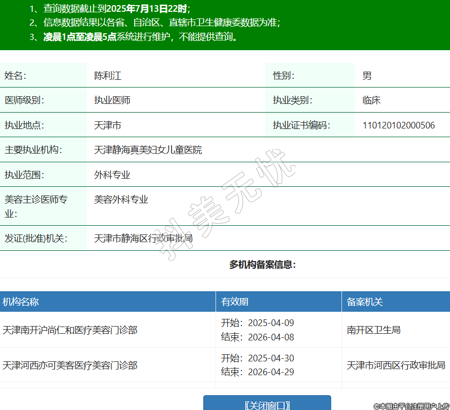 姓名:陳利江性別:男醫(yī)師級(jí)別:執(zhí)業(yè)醫(yī)師執(zhí)業(yè)類(lèi)別:臨床執(zhí)業(yè)地點(diǎn):天津市執(zhí)業(yè)證書(shū)編碼:110120102000506主要執(zhí)業(yè)機(jī)構(gòu):天津靜海真美婦女兒童醫(yī)院執(zhí)業(yè)范圍:外科專(zhuān)業(yè)美容主診醫(yī)師專(zhuān)業(yè):美容外科專(zhuān)業(yè)發(fā)證(批準(zhǔn))機(jī)關(guān):天津市靜海區(qū)行政審批局多機(jī)構(gòu)備案信息:機(jī)構(gòu)名稱(chēng) 有效期 備案機(jī)關(guān) 天津南開(kāi)滬尚仁和醫(yī)療美容門(mén)診部 開(kāi)始:2025-04-09結(jié)束:2026-04-08南開(kāi)區(qū)衛(wèi)生局 天津河西亦可美客醫(yī)療美容門(mén)診部 開(kāi)始:2025-04-30結(jié)束:2026-04-29天津市河西區(qū)行政審批局 天津美安心醫(yī)療美容門(mén)診部 開(kāi)始:2025-05-16結(jié)束:2026-05-15濱海新區(qū)衛(wèi)生局 天津南開(kāi)悅潼醫(yī)療美容診所 開(kāi)始:2025-05-19結(jié)束:2026-05-18南開(kāi)區(qū)衛(wèi)生局 天津南開(kāi)赫泰佳顏醫(yī)療美容診所 開(kāi)始:2025-05-27結(jié)束:2026-05-26南開(kāi)區(qū)衛(wèi)生局 天津和平華美天顏醫(yī)療美容門(mén)診部 開(kāi)始:2025-06-06結(jié)束:2026-06-05天津市和平區(qū)衛(wèi)生健康委員會(huì) 天津河?xùn)|星辰醫(yī)療美容診所 開(kāi)始:2025-06-29結(jié)束:2026-06-28河?xùn)|區(qū)衛(wèi)生局 天津靜海瑞禾醫(yī)療美容診所 開(kāi)始:2025-07-09結(jié)束:2026-07-08天津市靜海區(qū)行政審批局 -