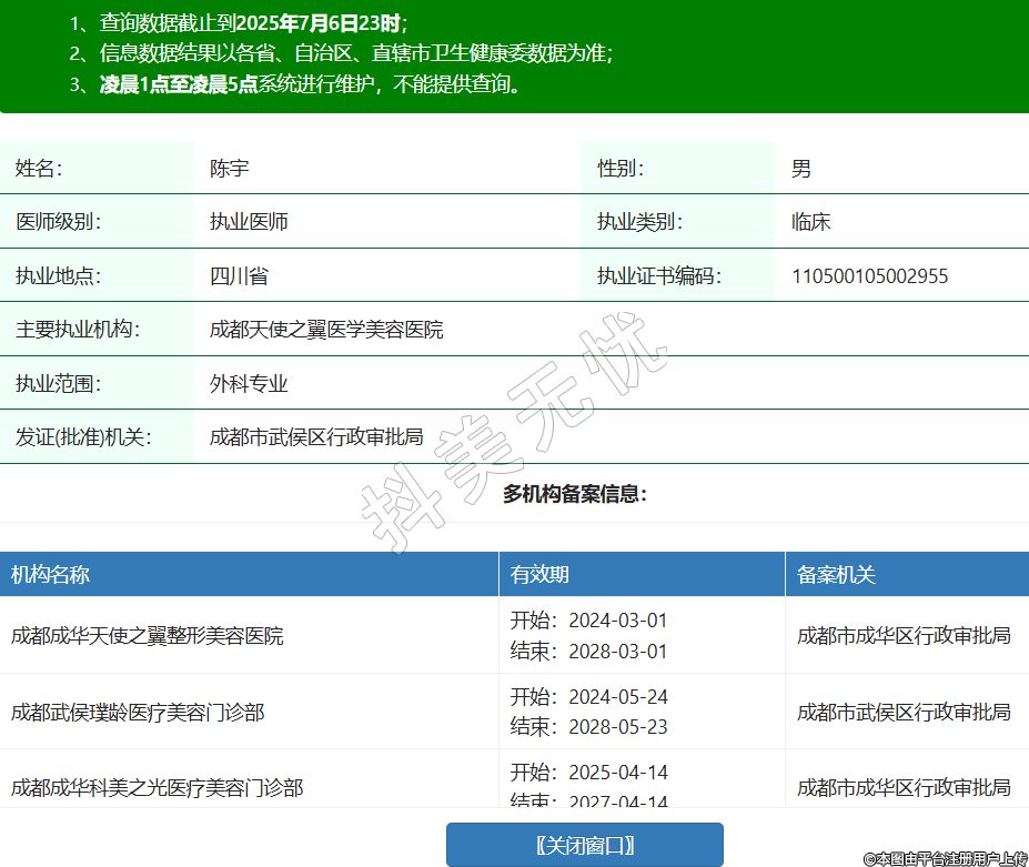 姓名:陳宇性別:男醫(yī)師級別:執(zhí)業(yè)醫(yī)師執(zhí)業(yè)類別:臨床執(zhí)業(yè)地點(diǎn):四川省執(zhí)業(yè)證書編碼:110500105002955主要執(zhí)業(yè)機(jī)構(gòu):成都天使之翼醫(yī)學(xué)美容醫(yī)院執(zhí)業(yè)范圍:外科專業(yè)發(fā)證(批準(zhǔn))機(jī)關(guān):成都市武侯區(qū)行政審批局多機(jī)構(gòu)備案信息:機(jī)構(gòu)名稱 有效期 備案機(jī)關(guān) 成都成華天使之翼整形美容醫(yī)院 開始:2024-03-01結(jié)束:2028-03-01成都市成華區(qū)行政審批局 成都武侯璞齡醫(yī)療美容門診部 開始:2024-05-24結(jié)束:2028-05-23成都市武侯區(qū)行政審批局 成都成華科美之光醫(yī)療美容門診部 開始:2025-04-14結(jié)束:2027-04-14成都市成華區(qū)行政審批局 -