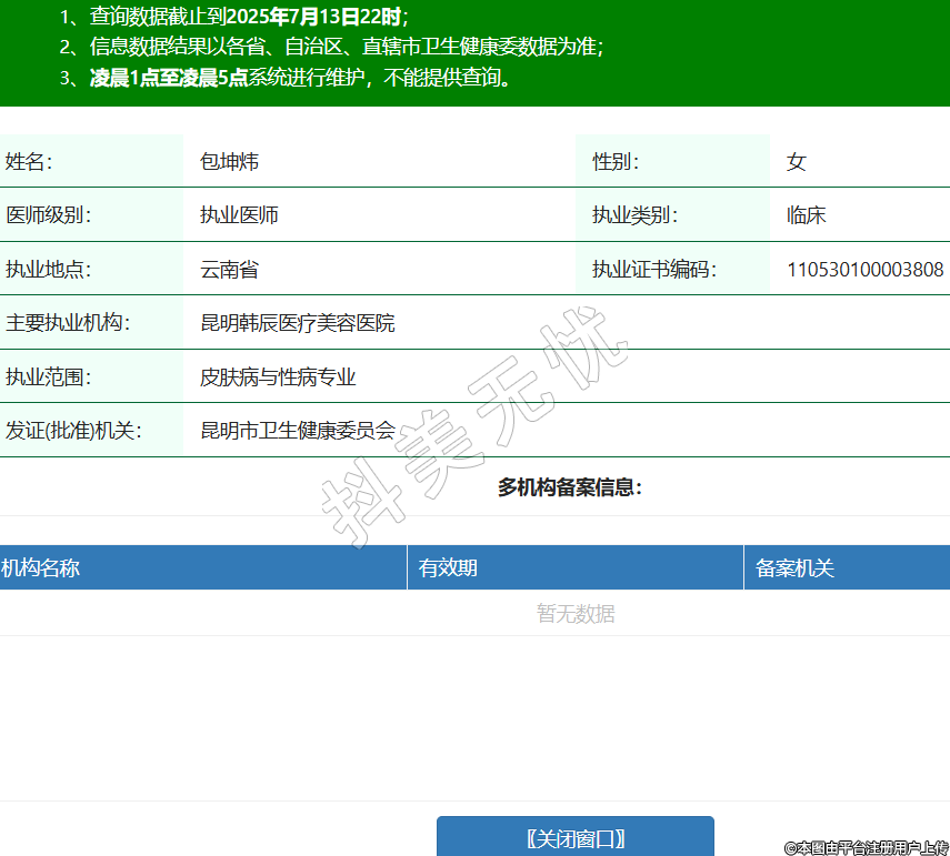姓名:包坤煒性別:女醫(yī)師級(jí)別:執(zhí)業(yè)醫(yī)師執(zhí)業(yè)類別:臨床執(zhí)業(yè)地點(diǎn):云南省執(zhí)業(yè)證書編碼:110530100003808主要執(zhí)業(yè)機(jī)構(gòu):昆明韓辰醫(yī)療美容醫(yī)院執(zhí)業(yè)范圍:皮膚病與性病專業(yè)發(fā)證(批準(zhǔn))機(jī)關(guān):昆明市衛(wèi)生健康委員會(huì) -