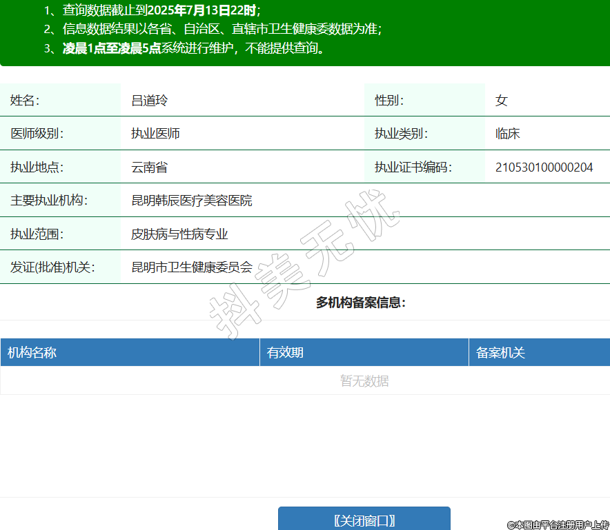 姓名:呂道玲性別:女醫(yī)師級(jí)別:執(zhí)業(yè)醫(yī)師執(zhí)業(yè)類別:臨床執(zhí)業(yè)地點(diǎn):云南省執(zhí)業(yè)證書編碼:210530100000204主要執(zhí)業(yè)機(jī)構(gòu):昆明韓辰醫(yī)療美容醫(yī)院執(zhí)業(yè)范圍:皮膚病與性病專業(yè)發(fā)證(批準(zhǔn))機(jī)關(guān):昆明市衛(wèi)生健康委員會(huì) -