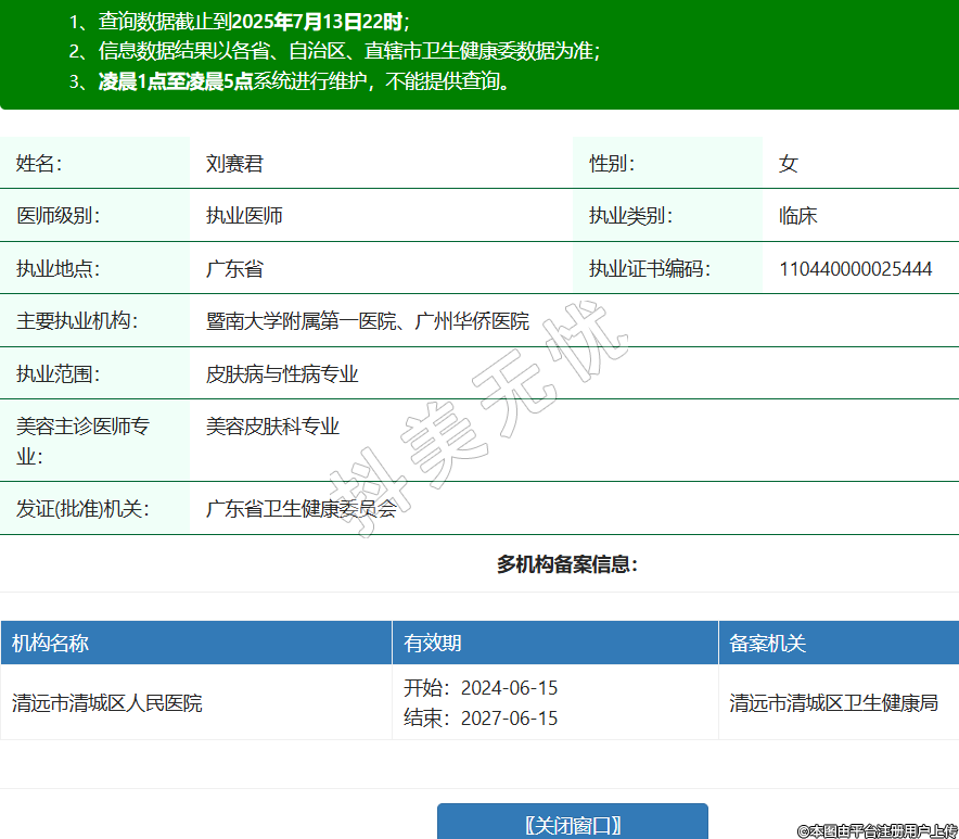 姓名:劉賽君性別:女醫(yī)師級別:執(zhí)業(yè)醫(yī)師執(zhí)業(yè)類別:臨床執(zhí)業(yè)地點:廣東省執(zhí)業(yè)證書編碼:110440000025444主要執(zhí)業(yè)機構:暨南大學附屬第一醫(yī)院、廣州華僑醫(yī)院執(zhí)業(yè)范圍:皮膚病與性病專業(yè)美容主診醫(yī)師專業(yè):美容皮膚科專業(yè)發(fā)證(批準)機關:廣東省衛(wèi)生健康委員會多機構備案信息:機構名稱 有效期 備案機關 清遠市清城區(qū)人民醫(yī)院 開始:2024-06-15結束:2027-06-15清遠市清城區(qū)衛(wèi)生健康局 -