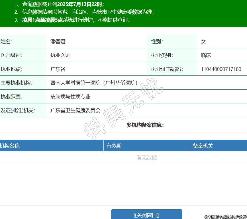 姓名:潘香君性別:女醫(yī)師級別:執(zhí)業(yè)醫(yī)師執(zhí)業(yè)類別:臨床執(zhí)業(yè)地點:廣東省執(zhí)業(yè)證書編碼:110440000717180主要執(zhí)業(yè)機構(gòu):暨南大學(xué)附屬第一醫(yī)院(廣州華僑醫(yī)院)執(zhí)業(yè)范圍:皮膚病與性病專業(yè)發(fā)證(批準)機關(guān):廣東省衛(wèi)生健康委員會 -