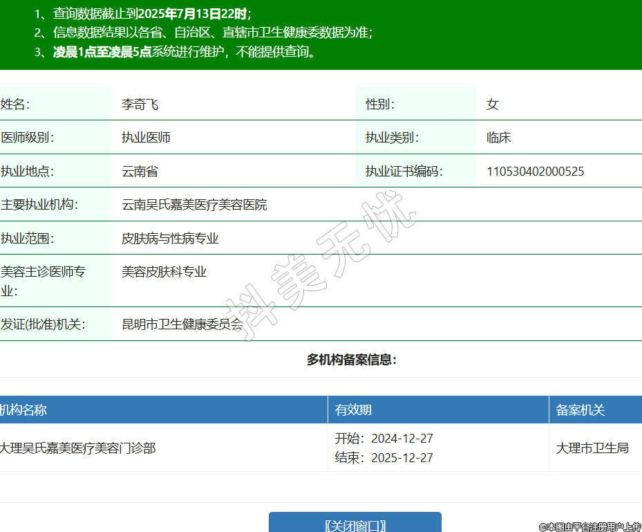 姓名:李奇飛性別:女醫(yī)師級別:執(zhí)業(yè)醫(yī)師執(zhí)業(yè)類別:臨床執(zhí)業(yè)地點(diǎn):云南省執(zhí)業(yè)證書編碼:110530402000525主要執(zhí)業(yè)機(jī)構(gòu):云南吳氏嘉美醫(yī)療美容醫(yī)院執(zhí)業(yè)范圍:皮膚病與性病專業(yè)美容主診醫(yī)師專業(yè):美容皮膚科專業(yè)發(fā)證(批準(zhǔn))機(jī)關(guān):昆明市衛(wèi)生健康委員會(huì)多機(jī)構(gòu)備案信息:機(jī)構(gòu)名稱 有效期 備案機(jī)關(guān) 大理吳氏嘉美醫(yī)療美容門診部 開始:2024-12-27結(jié)束:2025-12-27大理市衛(wèi)生局 -