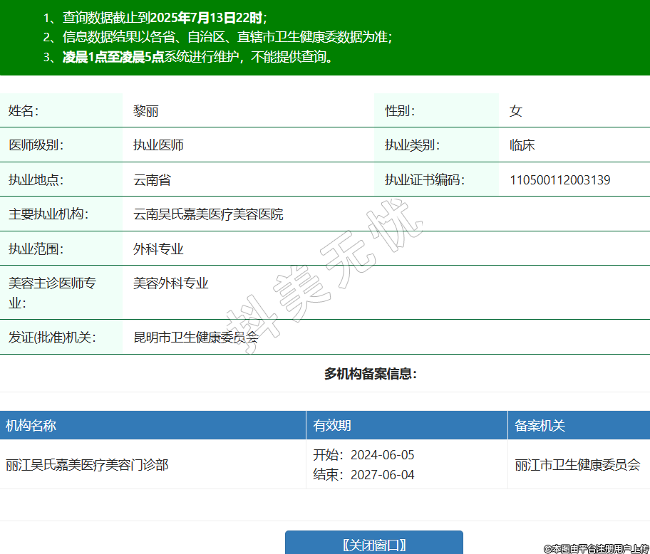 姓名:黎麗性別:女醫(yī)師級別:執(zhí)業(yè)醫(yī)師執(zhí)業(yè)類別:臨床執(zhí)業(yè)地點:云南省執(zhí)業(yè)證書編碼:110500112003139主要執(zhí)業(yè)機構:云南吳氏嘉美醫(yī)療美容醫(yī)院執(zhí)業(yè)范圍:外科專業(yè)美容主診醫(yī)師專業(yè):美容外科專業(yè)發(fā)證(批準)機關:昆明市衛(wèi)生健康委員會多機構備案信息:機構名稱 有效期 備案機關 麗江吳氏嘉美醫(yī)療美容門診部 開始:2024-06-05結束:2027-06-04麗江市衛(wèi)生健康委員會 -