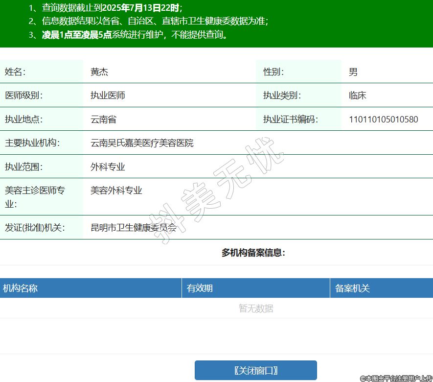 姓名:黃杰性別:男醫(yī)師級別:執(zhí)業(yè)醫(yī)師執(zhí)業(yè)類別:臨床執(zhí)業(yè)地點:云南省執(zhí)業(yè)證書編碼:110110105010580主要執(zhí)業(yè)機構(gòu):云南吳氏嘉美醫(yī)療美容醫(yī)院執(zhí)業(yè)范圍:外科專業(yè)美容主診醫(yī)師專業(yè):美容外科專業(yè)發(fā)證(批準(zhǔn))機關(guān):昆明市衛(wèi)生健康委員會 -