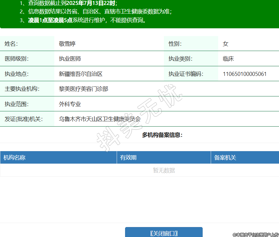姓名:敬雪婷性別:女醫(yī)師級(jí)別:執(zhí)業(yè)醫(yī)師執(zhí)業(yè)類別:臨床執(zhí)業(yè)地點(diǎn):新疆維吾爾自治區(qū)執(zhí)業(yè)證書編碼:110650100005061主要執(zhí)業(yè)機(jī)構(gòu):黎美醫(yī)療美容門診部執(zhí)業(yè)范圍:外科專業(yè)發(fā)證(批準(zhǔn))機(jī)關(guān):烏魯木齊市天山區(qū)衛(wèi)生健康委員會(huì) -