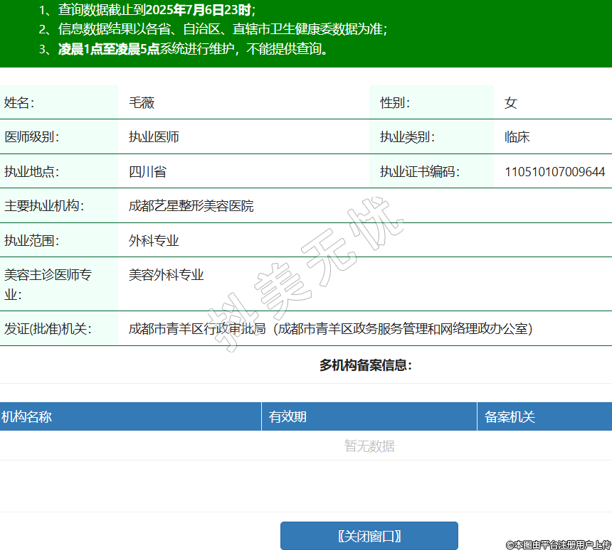 姓名:毛薇性別:女醫(yī)師級(jí)別:執(zhí)業(yè)醫(yī)師執(zhí)業(yè)類別:臨床執(zhí)業(yè)地點(diǎn):四川省執(zhí)業(yè)證書編碼:110510107009644主要執(zhí)業(yè)機(jī)構(gòu):成都藝星整形美容醫(yī)院執(zhí)業(yè)范圍:外科專業(yè)美容主診醫(yī)師專業(yè):美容外科專業(yè)發(fā)證(批準(zhǔn))機(jī)關(guān):成都市青羊區(qū)行政審批局(成都市青羊區(qū)政務(wù)服務(wù)管理和網(wǎng)絡(luò)理政辦公室) -