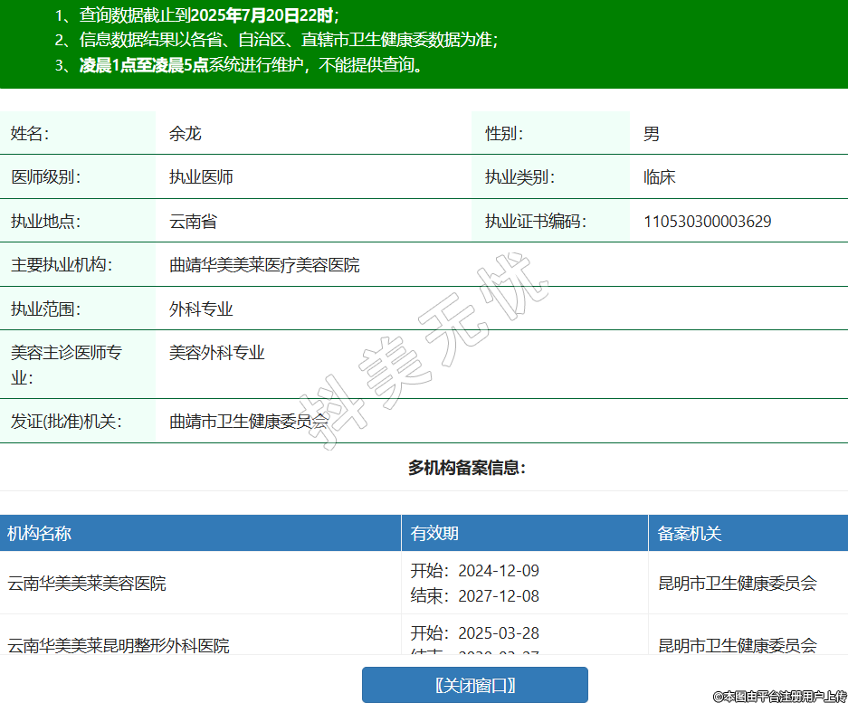 姓名:余龍性別:男醫(yī)師級別:執(zhí)業(yè)醫(yī)師執(zhí)業(yè)類別:臨床執(zhí)業(yè)地點:云南省執(zhí)業(yè)證書編碼:110530300003629主要執(zhí)業(yè)機構(gòu):曲靖華美美萊醫(yī)療美容醫(yī)院執(zhí)業(yè)范圍:外科專業(yè)美容主診醫(yī)師專業(yè):美容外科專業(yè)發(fā)證(批準)機關(guān):曲靖市衛(wèi)生健康委員會多機構(gòu)備案信息:機構(gòu)名稱 有效期 備案機關(guān) 云南華美美萊美容醫(yī)院 開始:2024-12-09結(jié)束:2027-12-08昆明市衛(wèi)生健康委員會 云南華美美萊昆明整形外科醫(yī)院 開始:2025-03-28結(jié)束:2030-03-27昆明市衛(wèi)生健康委員會 -