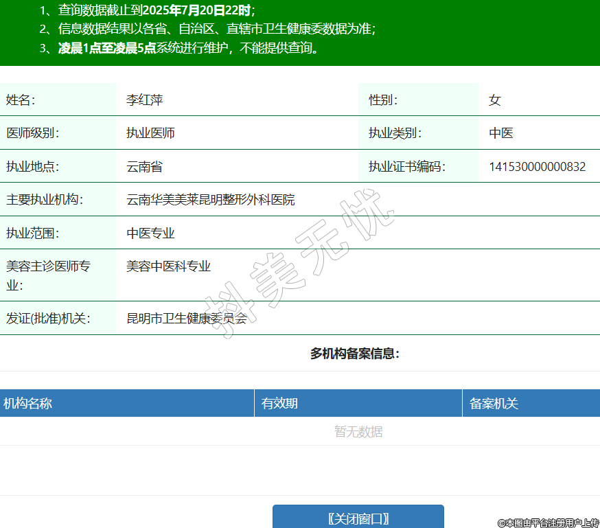 姓名:李紅萍性別:女醫(yī)師級別:執(zhí)業(yè)醫(yī)師執(zhí)業(yè)類別:中醫(yī)執(zhí)業(yè)地點:云南省執(zhí)業(yè)證書編碼:141530000000832主要執(zhí)業(yè)機構:云南華美美萊昆明整形外科醫(yī)院執(zhí)業(yè)范圍:中醫(yī)專業(yè)美容主診醫(yī)師專業(yè):美容中醫(yī)科專業(yè)發(fā)證(批準)機關:昆明市衛(wèi)生健康委員會 -