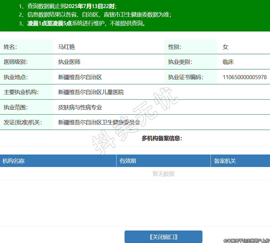 姓名:馬紅艷性別:女醫(yī)師級(jí)別:執(zhí)業(yè)醫(yī)師執(zhí)業(yè)類別:臨床執(zhí)業(yè)地點(diǎn):新疆維吾爾自治區(qū)執(zhí)業(yè)證書編碼:110650000005978主要執(zhí)業(yè)機(jī)構(gòu):新疆維吾爾自治區(qū)兒童醫(yī)院執(zhí)業(yè)范圍:皮膚病與性病專業(yè)發(fā)證(批準(zhǔn))機(jī)關(guān):新疆維吾爾自治區(qū)衛(wèi)生健康委員會(huì) -