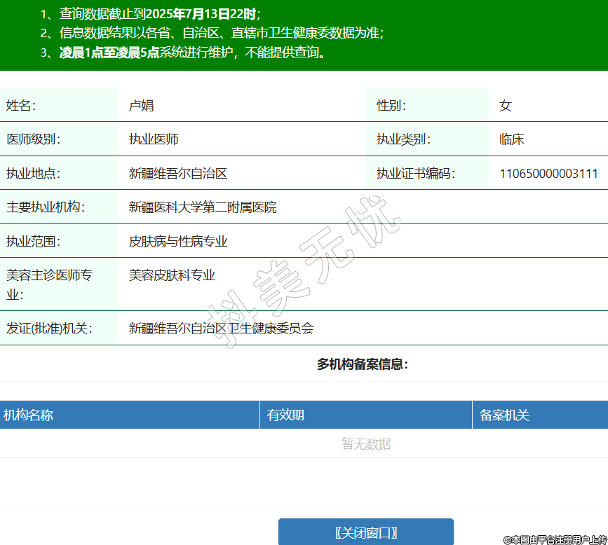 姓名:盧娟性別:女醫(yī)師級別:執(zhí)業(yè)醫(yī)師執(zhí)業(yè)類別:臨床執(zhí)業(yè)地點:新疆維吾爾自治區(qū)執(zhí)業(yè)證書編碼:110650000003111主要執(zhí)業(yè)機構(gòu):新疆醫(yī)科大學(xué)第二附屬醫(yī)院執(zhí)業(yè)范圍:皮膚病與性病專業(yè)美容主診醫(yī)師專業(yè):美容皮膚科專業(yè)發(fā)證(批準)機關(guān):新疆維吾爾自治區(qū)衛(wèi)生健康委員會 -