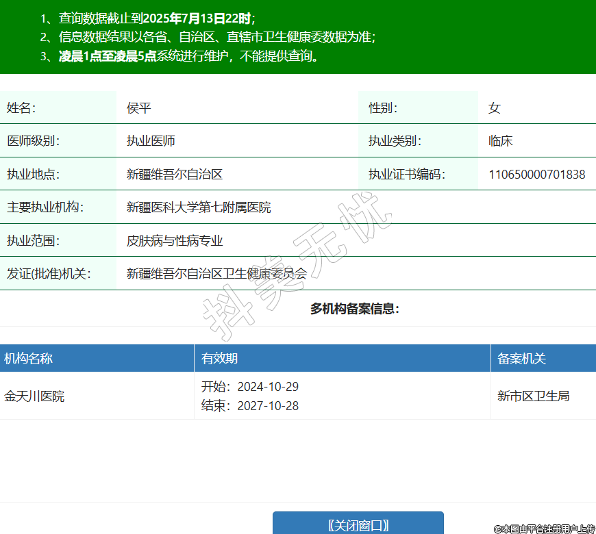 姓名:侯平性別:女醫(yī)師級別:執(zhí)業(yè)醫(yī)師執(zhí)業(yè)類別:臨床執(zhí)業(yè)地點(diǎn):新疆維吾爾自治區(qū)執(zhí)業(yè)證書編碼:110650000701838主要執(zhí)業(yè)機(jī)構(gòu):新疆醫(yī)科大學(xué)第七附屬醫(yī)院執(zhí)業(yè)范圍:皮膚病與性病專業(yè)發(fā)證(批準(zhǔn))機(jī)關(guān):新疆維吾爾自治區(qū)衛(wèi)生健康委員會多機(jī)構(gòu)備案信息:機(jī)構(gòu)名稱 有效期 備案機(jī)關(guān) 金天川醫(yī)院 開始:2024-10-29結(jié)束:2027-10-28新市區(qū)衛(wèi)生局 -