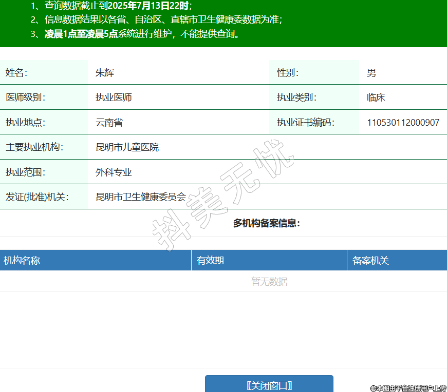 姓名:朱輝性別:男醫(yī)師級別:執(zhí)業(yè)醫(yī)師執(zhí)業(yè)類別:臨床執(zhí)業(yè)地點:云南省執(zhí)業(yè)證書編碼:110530112000907主要執(zhí)業(yè)機構(gòu):昆明市兒童醫(yī)院執(zhí)業(yè)范圍:外科專業(yè)發(fā)證(批準(zhǔn))機關(guān):昆明市衛(wèi)生健康委員會 -