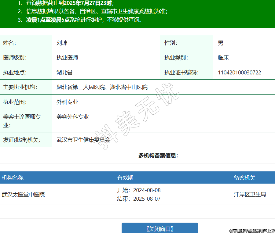 姓名:劉坤性別:男醫(yī)師級(jí)別:執(zhí)業(yè)醫(yī)師執(zhí)業(yè)類別:臨床執(zhí)業(yè)地點(diǎn):湖北省執(zhí)業(yè)證書編碼:110420100030722主要執(zhí)業(yè)機(jī)構(gòu):湖北省第三人民醫(yī)院、湖北省中山醫(yī)院執(zhí)業(yè)范圍:外科專業(yè)美容主診醫(yī)師專業(yè):美容外科專業(yè)發(fā)證(批準(zhǔn))機(jī)關(guān):武漢市衛(wèi)生健康委員會(huì)多機(jī)構(gòu)備案信息:機(jī)構(gòu)名稱 有效期 備案機(jī)關(guān) 武漢太醫(yī)堂中醫(yī)院 開始:2024-08-08結(jié)束:2025-08-07江岸區(qū)衛(wèi)生局 -