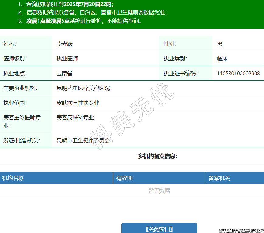 姓名:李光躍性別:男醫(yī)師級(jí)別:執(zhí)業(yè)醫(yī)師執(zhí)業(yè)類別:臨床執(zhí)業(yè)地點(diǎn):云南省執(zhí)業(yè)證書編碼:110530102002908主要執(zhí)業(yè)機(jī)構(gòu):昆明藝星醫(yī)療美容醫(yī)院執(zhí)業(yè)范圍:皮膚病與性病專業(yè)美容主診醫(yī)師專業(yè):美容皮膚科專業(yè)發(fā)證(批準(zhǔn))機(jī)關(guān):昆明市衛(wèi)生健康委員會(huì) -