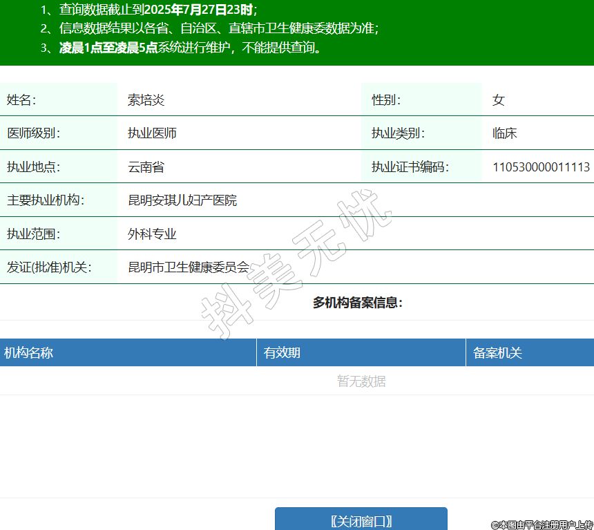 姓名:索培炎性別:女醫(yī)師級別:執(zhí)業(yè)醫(yī)師執(zhí)業(yè)類別:臨床執(zhí)業(yè)地點(diǎn):云南省執(zhí)業(yè)證書編碼:110530000011113主要執(zhí)業(yè)機(jī)構(gòu):昆明安琪兒婦產(chǎn)醫(yī)院執(zhí)業(yè)范圍:外科專業(yè)發(fā)證(批準(zhǔn))機(jī)關(guān):昆明市衛(wèi)生健康委員會 -