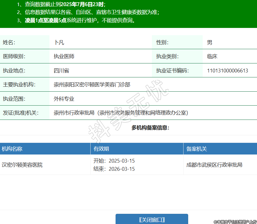姓名:卜凡性別:男醫(yī)師級別:執(zhí)業(yè)醫(yī)師執(zhí)業(yè)類別:臨床執(zhí)業(yè)地點:四川省執(zhí)業(yè)證書編碼:110131000006613主要執(zhí)業(yè)機構(gòu):崇州崇陽漢密爾頓醫(yī)學(xué)美容門診部執(zhí)業(yè)范圍:外科專業(yè)發(fā)證(批準(zhǔn))機關(guān):崇州市行政審批局(崇州市政務(wù)服務(wù)管理和網(wǎng)絡(luò)理政辦公室)多機構(gòu)備案信息:機構(gòu)名稱 有效期 備案機關(guān) 漢密爾頓美容醫(yī)院 開始:2025-03-15結(jié)束:2026-03-15成都市武侯區(qū)行政審批局 -