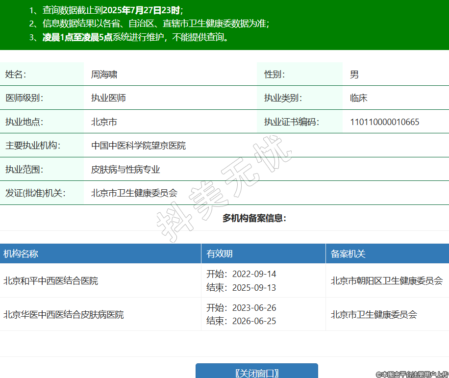 姓名:周海嘯性別:男醫(yī)師級(jí)別:執(zhí)業(yè)醫(yī)師執(zhí)業(yè)類(lèi)別:臨床執(zhí)業(yè)地點(diǎn):北京市執(zhí)業(yè)證書(shū)編碼:110110000010665主要執(zhí)業(yè)機(jī)構(gòu):中國(guó)中醫(yī)科學(xué)院望京醫(yī)院執(zhí)業(yè)范圍:皮膚病與性病專(zhuān)業(yè)發(fā)證(批準(zhǔn))機(jī)關(guān):北京市衛(wèi)生健康委員會(huì)多機(jī)構(gòu)備案信息:機(jī)構(gòu)名稱(chēng) 有效期 備案機(jī)關(guān) 北京和平中西醫(yī)結(jié)合醫(yī)院 開(kāi)始:2022-09-14結(jié)束:2025-09-13北京市朝陽(yáng)區(qū)衛(wèi)生健康委員會(huì) 北京華醫(yī)中西醫(yī)結(jié)合皮膚病醫(yī)院 開(kāi)始:2023-06-26結(jié)束:2026-06-25北京市衛(wèi)生健康委員會(huì) -