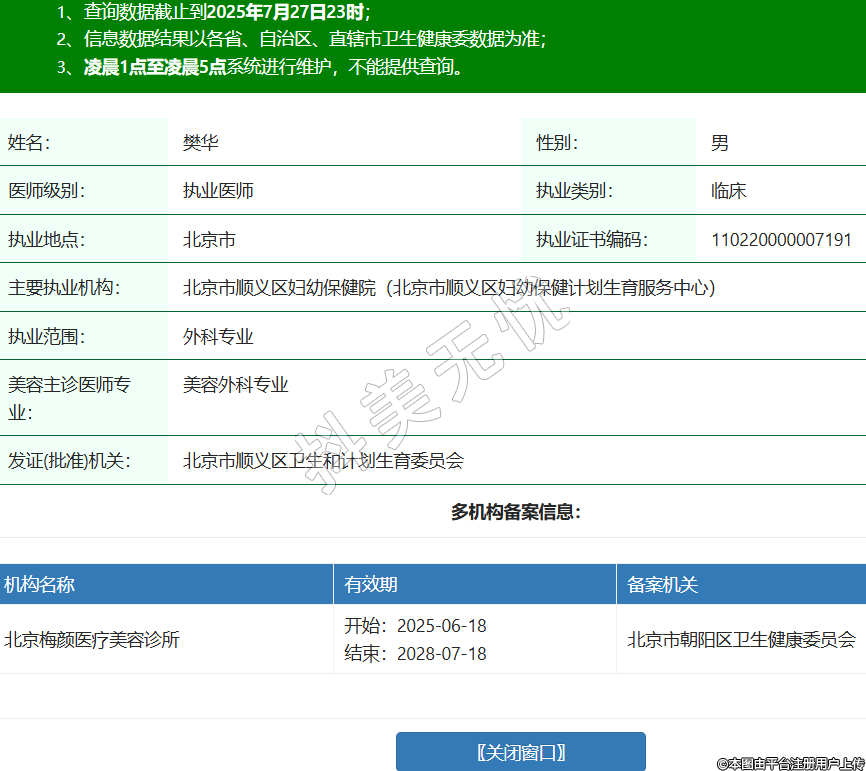 姓名:樊華性別:男醫(yī)師級別:執(zhí)業(yè)醫(yī)師執(zhí)業(yè)類別:臨床執(zhí)業(yè)地點:北京市執(zhí)業(yè)證書編碼:110220000007191主要執(zhí)業(yè)機構(gòu):北京市順義區(qū)婦幼保健院(北京市順義區(qū)婦幼保健計劃生育服務中心)執(zhí)業(yè)范圍:外科專業(yè)美容主診醫(yī)師專業(yè):美容外科專業(yè)發(fā)證(批準)機關(guān):北京市順義區(qū)衛(wèi)生和計劃生育委員會多機構(gòu)備案信息:機構(gòu)名稱 有效期 備案機關(guān) 北京梅顏醫(yī)療美容診所 開始:2025-06-18結(jié)束:2028-07-18北京市朝陽區(qū)衛(wèi)生健康委員會 -