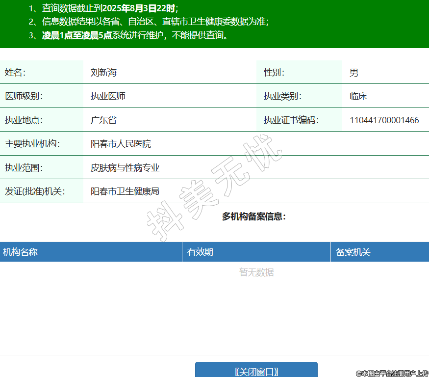 姓名:劉新海性別:男醫(yī)師級別:執(zhí)業(yè)醫(yī)師執(zhí)業(yè)類別:臨床執(zhí)業(yè)地點:廣東省執(zhí)業(yè)證書編碼:110441700001466主要執(zhí)業(yè)機構(gòu):陽春市人民醫(yī)院執(zhí)業(yè)范圍:皮膚病與性病專業(yè)發(fā)證(批準(zhǔn))機關(guān):陽春市衛(wèi)生健康局 -