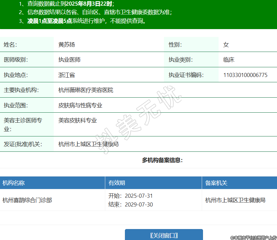 姓名:黃蘇揚(yáng)性別:女醫(yī)師級(jí)別:執(zhí)業(yè)醫(yī)師執(zhí)業(yè)類(lèi)別:臨床執(zhí)業(yè)地點(diǎn):浙江省執(zhí)業(yè)證書(shū)編碼:110330100006775主要執(zhí)業(yè)機(jī)構(gòu):杭州薇琳醫(yī)療美容醫(yī)院執(zhí)業(yè)范圍:皮膚病與性病專(zhuān)業(yè)美容主診醫(yī)師專(zhuān)業(yè):美容皮膚科專(zhuān)業(yè)發(fā)證(批準(zhǔn))機(jī)關(guān):杭州市上城區(qū)衛(wèi)生健康局多機(jī)構(gòu)備案信息:機(jī)構(gòu)名稱(chēng) 有效期 備案機(jī)關(guān) 杭州喜鵲綜合門(mén)診部 開(kāi)始:2025-07-31結(jié)束:2029-07-30杭州市上城區(qū)衛(wèi)生健康局 -