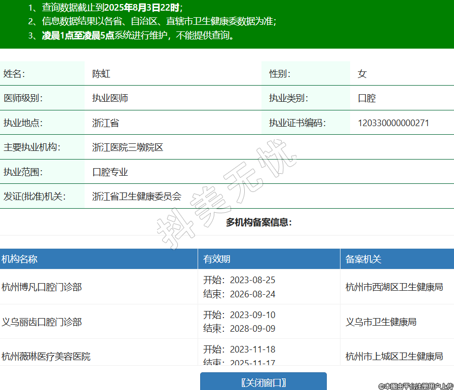 姓名:陳虹性別:女醫(yī)師級(jí)別:執(zhí)業(yè)醫(yī)師執(zhí)業(yè)類別:口腔執(zhí)業(yè)地點(diǎn):浙江省執(zhí)業(yè)證書編碼:120330000000271主要執(zhí)業(yè)機(jī)構(gòu):浙江醫(yī)院三墩院區(qū)執(zhí)業(yè)范圍:口腔專業(yè)發(fā)證(批準(zhǔn))機(jī)關(guān):浙江省衛(wèi)生健康委員會(huì)多機(jī)構(gòu)備案信息:機(jī)構(gòu)名稱 有效期 備案機(jī)關(guān) 杭州博凡口腔門診部 開始:2023-08-25結(jié)束:2026-08-24杭州市西湖區(qū)衛(wèi)生健康局 義烏麗齒口腔門診部 開始:2023-09-10結(jié)束:2028-09-09義烏市衛(wèi)生健康局 杭州薇琳醫(yī)療美容醫(yī)院 開始:2023-11-18結(jié)束:2025-11-17杭州市上城區(qū)衛(wèi)生健康局 浦江筱鳴口腔診所 開始:2023-12-01結(jié)束:2028-11-30浦江縣衛(wèi)生健康局 天臺(tái)徐娜口腔診所 開始:2024-11-01結(jié)束:2027-10-31天臺(tái)縣行政審批局 衢州市柯城金衢口腔門診部 開始:2025-04-25結(jié)束:2028-04-24衢州市柯城區(qū)衛(wèi)生健康局 -
