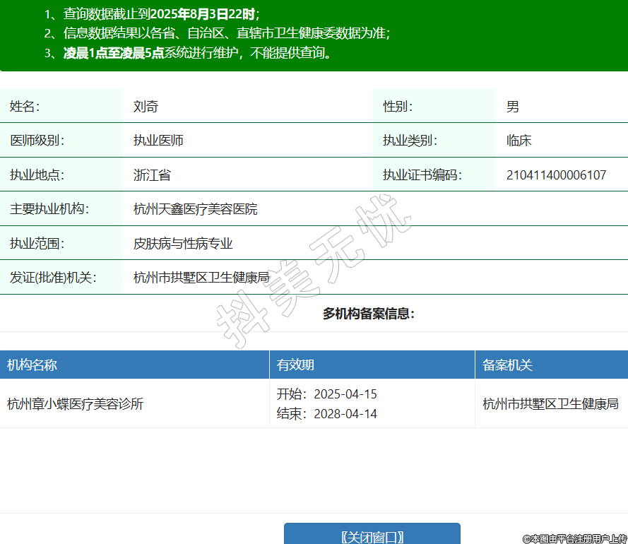 姓名:劉奇性別:男醫(yī)師級(jí)別:執(zhí)業(yè)醫(yī)師執(zhí)業(yè)類別:臨床執(zhí)業(yè)地點(diǎn):浙江省執(zhí)業(yè)證書(shū)編碼:210411400006107主要執(zhí)業(yè)機(jī)構(gòu):杭州天鑫醫(yī)療美容醫(yī)院執(zhí)業(yè)范圍:皮膚病與性病專業(yè)發(fā)證(批準(zhǔn))機(jī)關(guān):杭州市拱墅區(qū)衛(wèi)生健康局多機(jī)構(gòu)備案信息:機(jī)構(gòu)名稱 有效期 備案機(jī)關(guān) 杭州章小蝶醫(yī)療美容診所 開(kāi)始:2025-04-15結(jié)束:2028-04-14杭州市拱墅區(qū)衛(wèi)生健康局 -