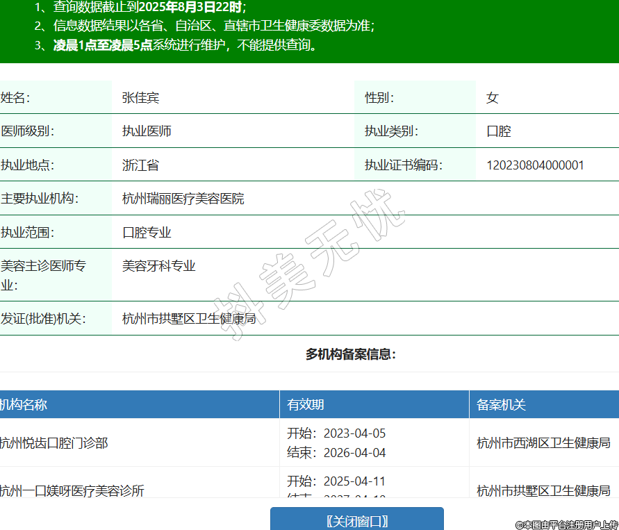 姓名:張佳賓性別:女醫(yī)師級(jí)別:執(zhí)業(yè)醫(yī)師執(zhí)業(yè)類(lèi)別:口腔執(zhí)業(yè)地點(diǎn):浙江省執(zhí)業(yè)證書(shū)編碼:120230804000001主要執(zhí)業(yè)機(jī)構(gòu):杭州瑞麗醫(yī)療美容醫(yī)院執(zhí)業(yè)范圍:口腔專(zhuān)業(yè)美容主診醫(yī)師專(zhuān)業(yè):美容牙科專(zhuān)業(yè)發(fā)證(批準(zhǔn))機(jī)關(guān):杭州市拱墅區(qū)衛(wèi)生健康局多機(jī)構(gòu)備案信息:機(jī)構(gòu)名稱(chēng) 有效期 備案機(jī)關(guān) 杭州悅齒口腔門(mén)診部 開(kāi)始:2023-04-05結(jié)束:2026-04-04杭州市西湖區(qū)衛(wèi)生健康局 杭州一口媄呀醫(yī)療美容診所 開(kāi)始:2025-04-11結(jié)束:2027-04-10杭州市拱墅區(qū)衛(wèi)生健康局 杭州蕭山滬顏醫(yī)療美容門(mén)診部 開(kāi)始:2025-07-24結(jié)束:2026-07-22杭州市蕭山區(qū)衛(wèi)生健康局 -